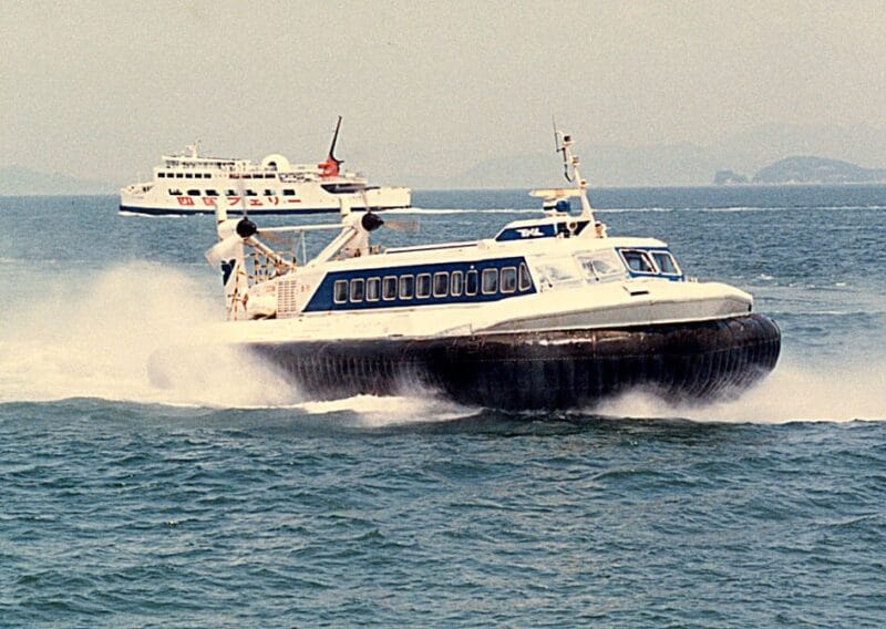 ほかにも、宇高航路には、昭和47年から、「かもめ」と「とびうお」という、日本の鉄道連絡船での唯一の急行便が就航していました。山陽新幹線開業から半年後に就航した、ホバークラフトです。ホバークラフトは急行扱いで、乗る際には国鉄・JRの乗車券に加えて船急行券(乗船便指定、座席は自由席)を別途料金で購入する必要がありました。エンジンはヘリコプターと同じガスタービンで、時速80kmで海面を飛ぶように走りました。 キャッチフレーズは「海の新幹線」で、カラーリングも白地にブルーのラインで新幹線に合わせていました。